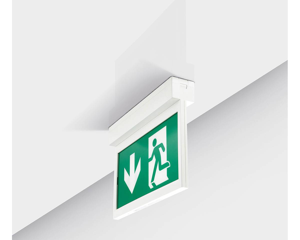 Exit signs direct and show people to the fire exits. The pictogram of the well-known green man is backlit to provide luminance to EN 60598-2-22 and EN 1838. The sign colours must also provide a contrast of between 5:1 and 15:1 so that they are clearly visible and understood.