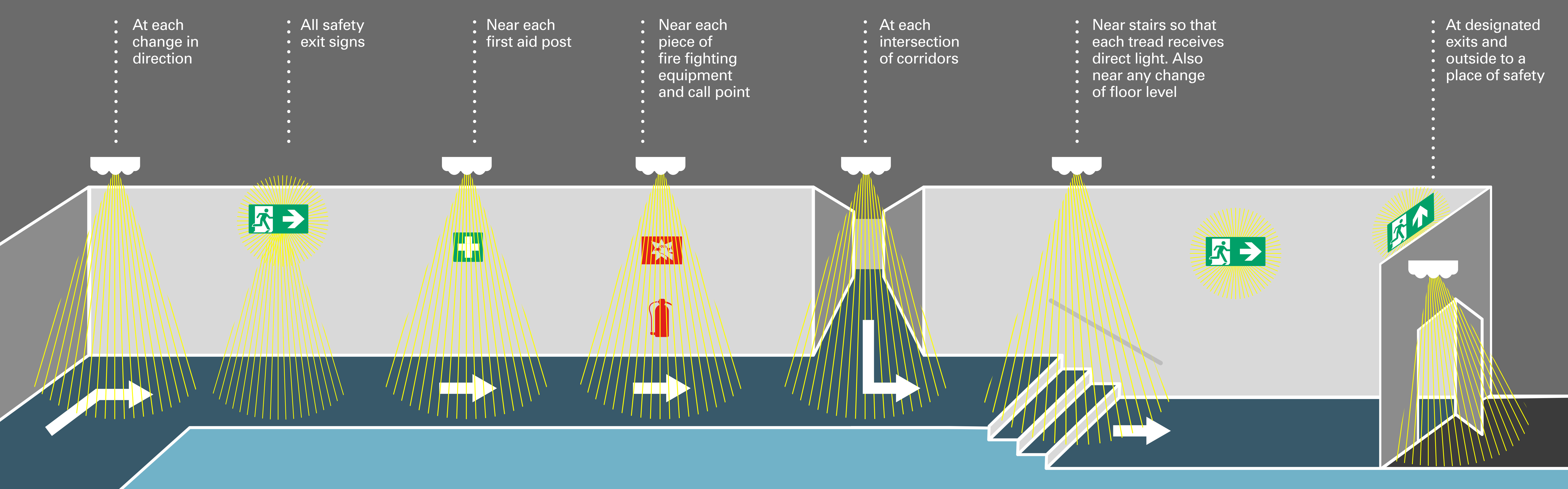 Your emergency lighting design must install luminaires to reveal specific hazards, such as a change in direction or stairs, and highlight safety equipment and signs. These are known as points of emphasis.