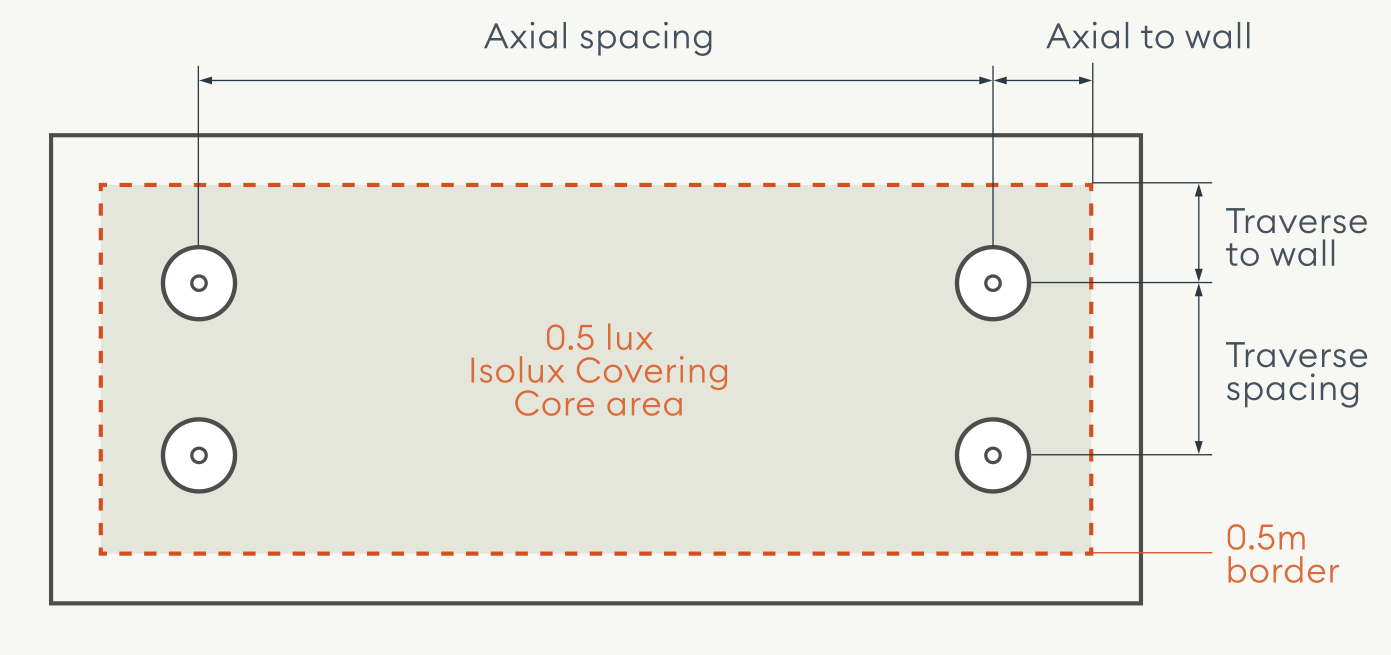 For open areas of larger than 60m2, or if it has an escape route passing through it, you must provide enough emergency lighting to achieve a minimum of 0.5 lux at ground level. However, you only need to consider the central area and not worry about the area that is 0.5m from the perimeter as people do not tend to move through this space.